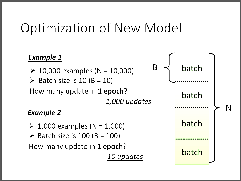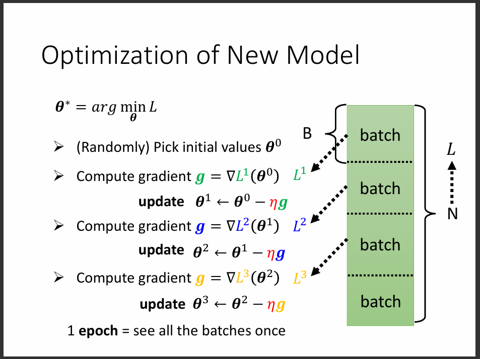 但是實際上我們不會拿整個資料集去做完整的一次更新參數,會把大資料集切分成多個batch, 每次要更新一次參數的時候,就拿一個batch去更新,稱為一次update,直到所有的batch都拿來更新為止。 而當我們把整個資料集,也就是所有batch都拿去更新完成之後,就稱為一次epoch,一次訓練可以有多次epoch。