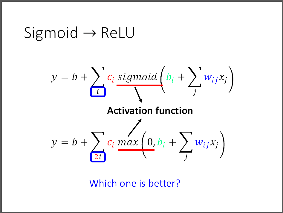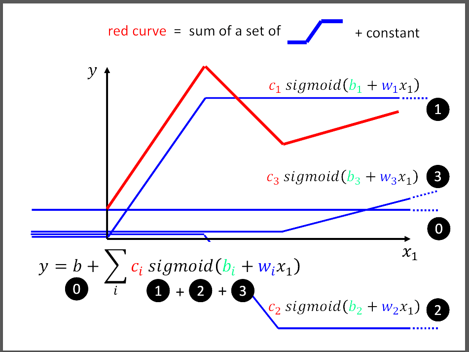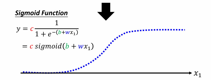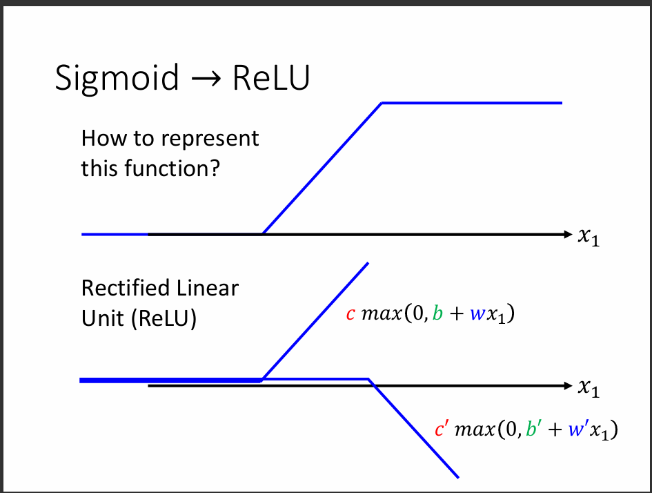 簡單的linear model很難應付許多的資料分布,也沒辦法很好的闡釋出這些資料之間的關係, 進而推得很好的預測。因此,這張圖說明我們可以利用很多的funciton,比方說圖片中的sigmoid function and constant function, 去拼湊出一個比較好的模型結構。這種用拼湊的模型就是Piecewise Linear Model。
