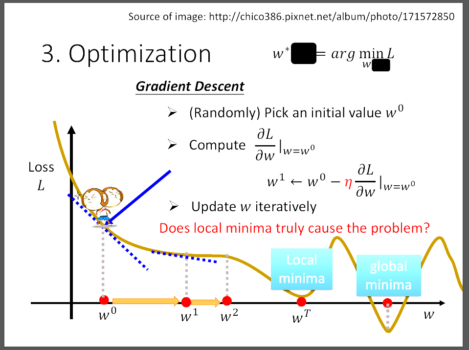 投影片中說明的是如何不斷更新模型(Loss Function)的參數,每一次當我們算出現在這個 Loss Function的Loss時,就會想要持續找出Loss最小的地方,更新weight也就是更新function的參數。 更新方式是找出這個點的切線斜率,若是切線斜率很大,則一次可以跨大一點的步伐(learning rate調大)。 並且若切線斜率小於0,則增加weight,若切線斜率大於0,則減少weight,直到到達local minimum。