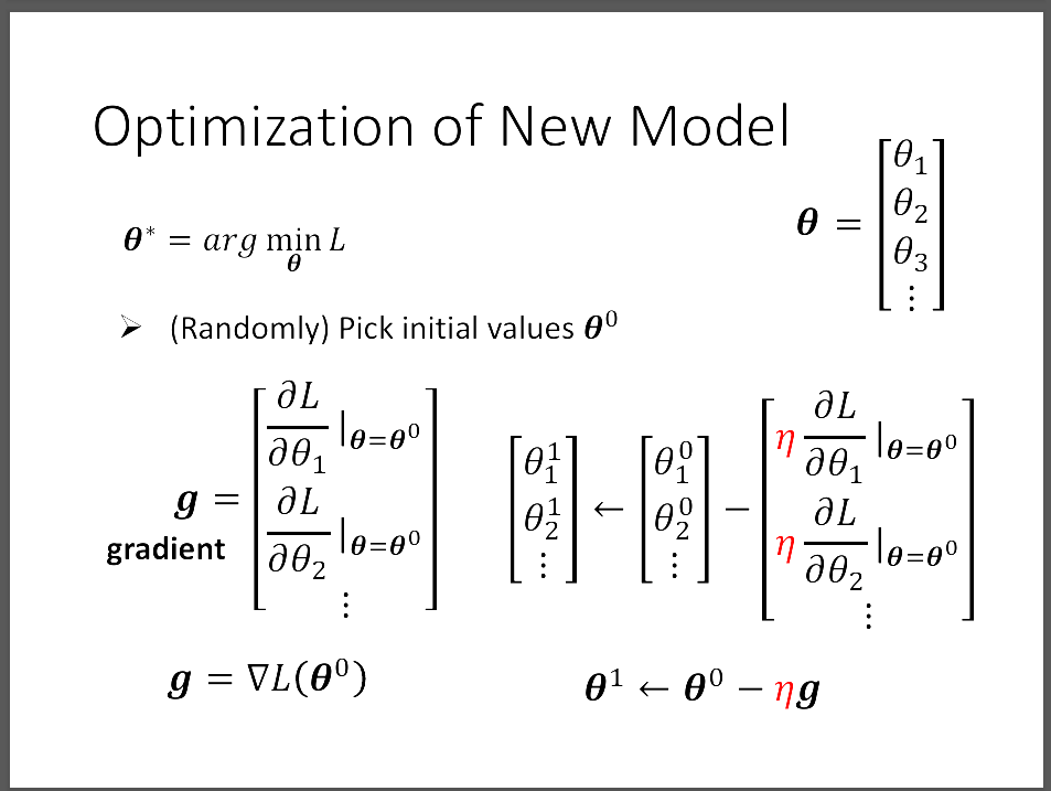 Gradient就是一個向量,裡面存放input的每個參數θ對Loss function的微分。然後把現在的gradientθ0減去η*第二次的gradientθ1,可得更新過的θ1。 持續計算直到不想做或是grandient為零向量,沒有辦法更新weight為止。但是現實生活中不太可能會出現gradient為零向量的情況發生。