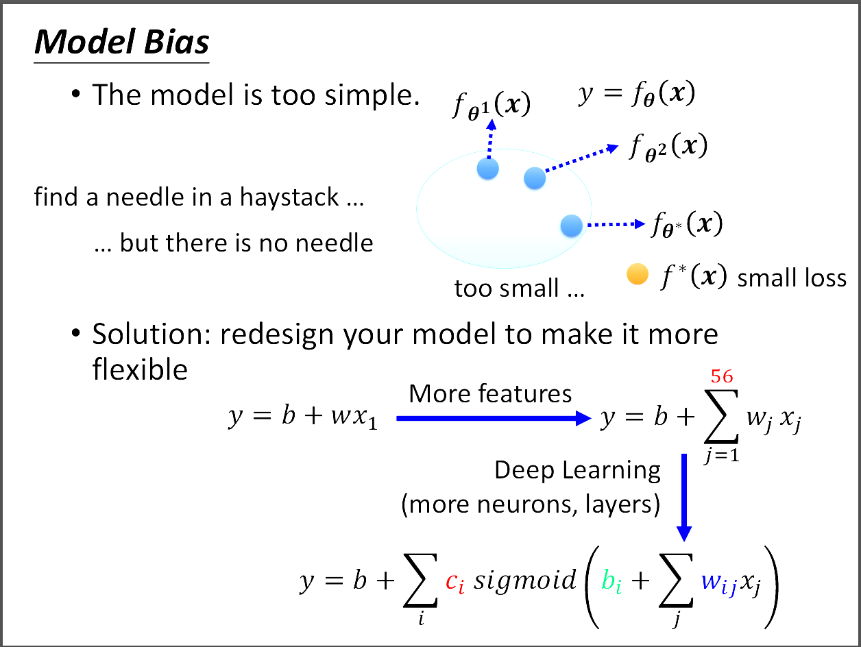 我們可以往Model Bias的方向思考。Model Bias是說明你設計的Model太小,