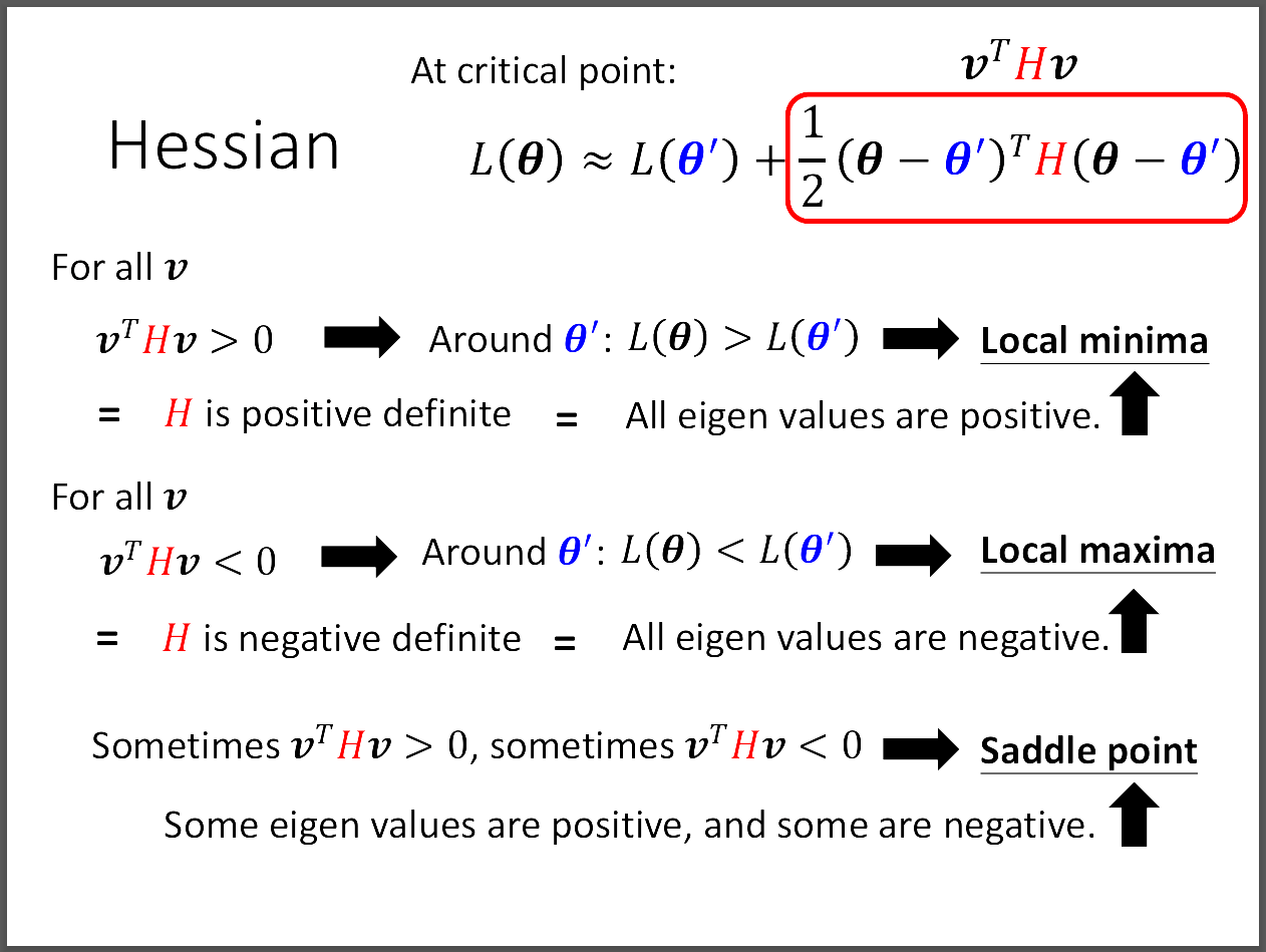 2. 若紅色部分小於零,代表周圍的任何θ所在的loss都小於該點,因此處在local maxima。