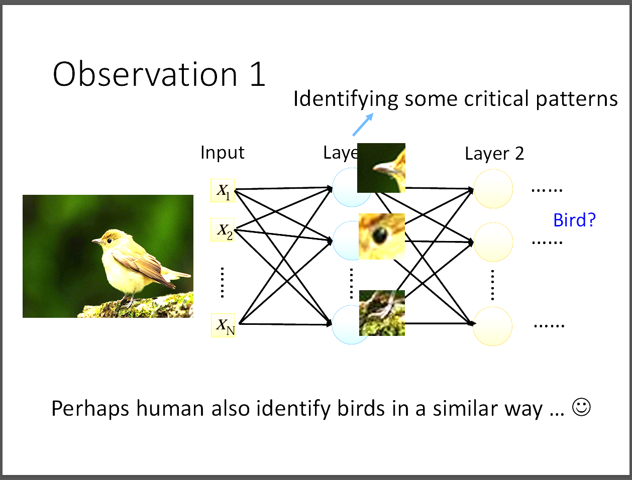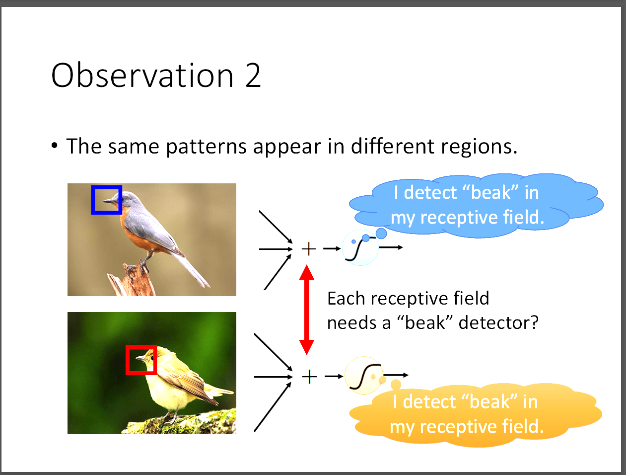 這張圖表示的是兩張圖片的鳥嘴位置不同,衍伸出一個問題,那就是如果我們在每個receptive field都有辨識鳥嘴的neuron會不會太多餘了。