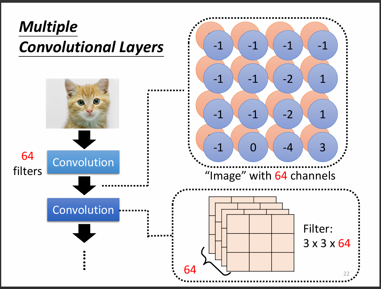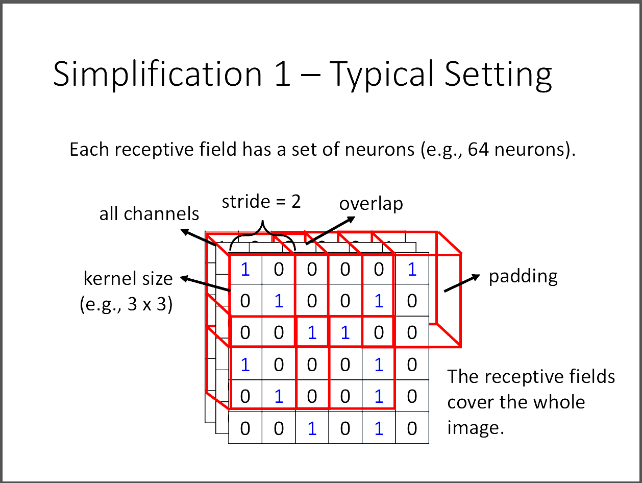 每一個receptive field都會有多個neuron(64、128等等),多個neuron可以學習到不同的特徵,比方說有學習鳥嘴的,有學習鳥眼睛的等等。