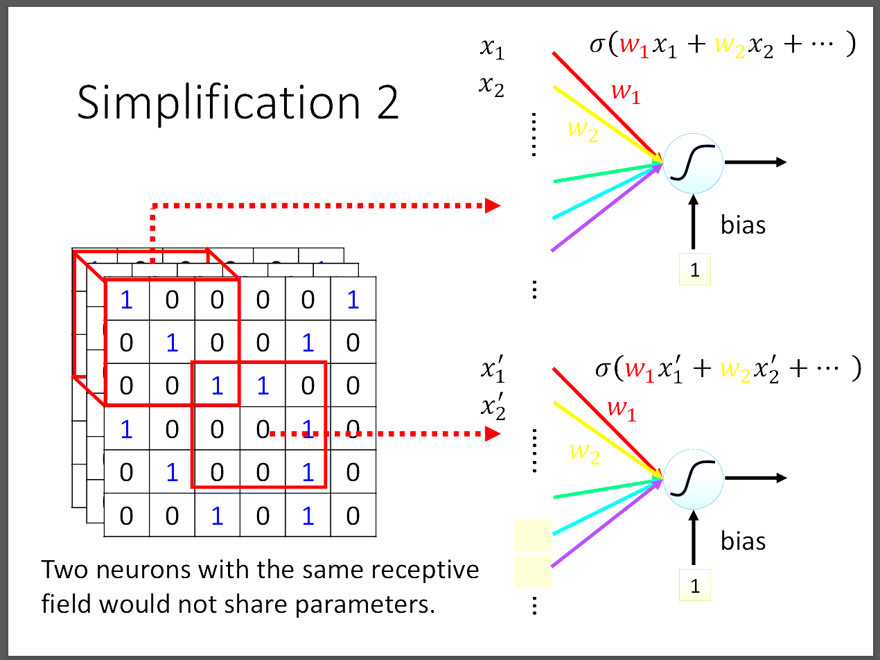 其實可以簡化許多的neuron讓他們彼此之間能夠溝通,這裡的溝通技巧就是parameter sharing。