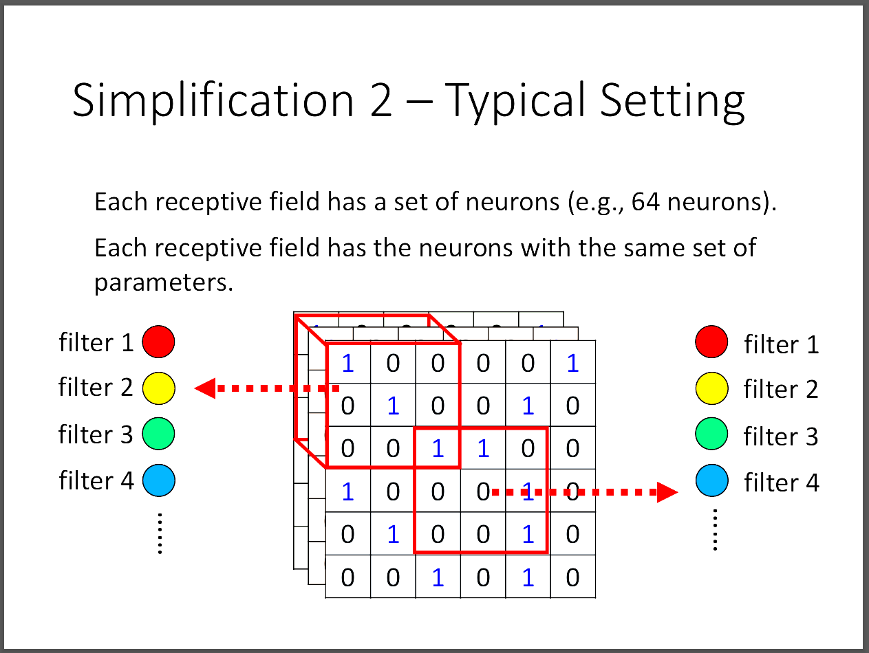 filter就是一個或一組neuron觀察相同的features,不同的receptive field有可能共享相同的filter來減少計算量以及overfitting的可能性。