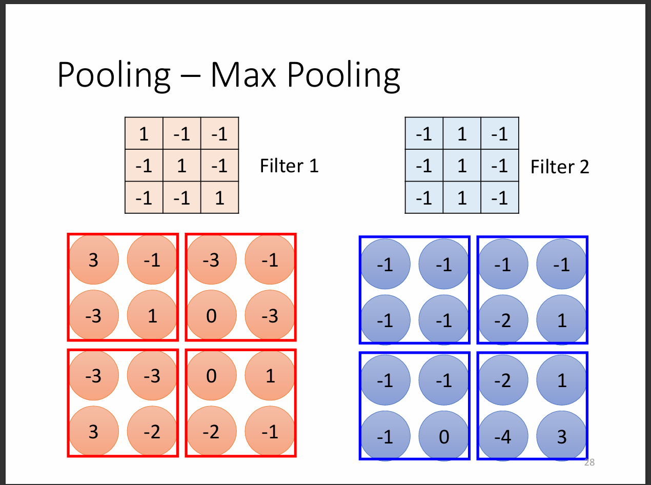 這裡我們介紹一個重要的方法,max pooling。從圖片中我們看到,當用filter掃過圖片之後得到一組feature map,