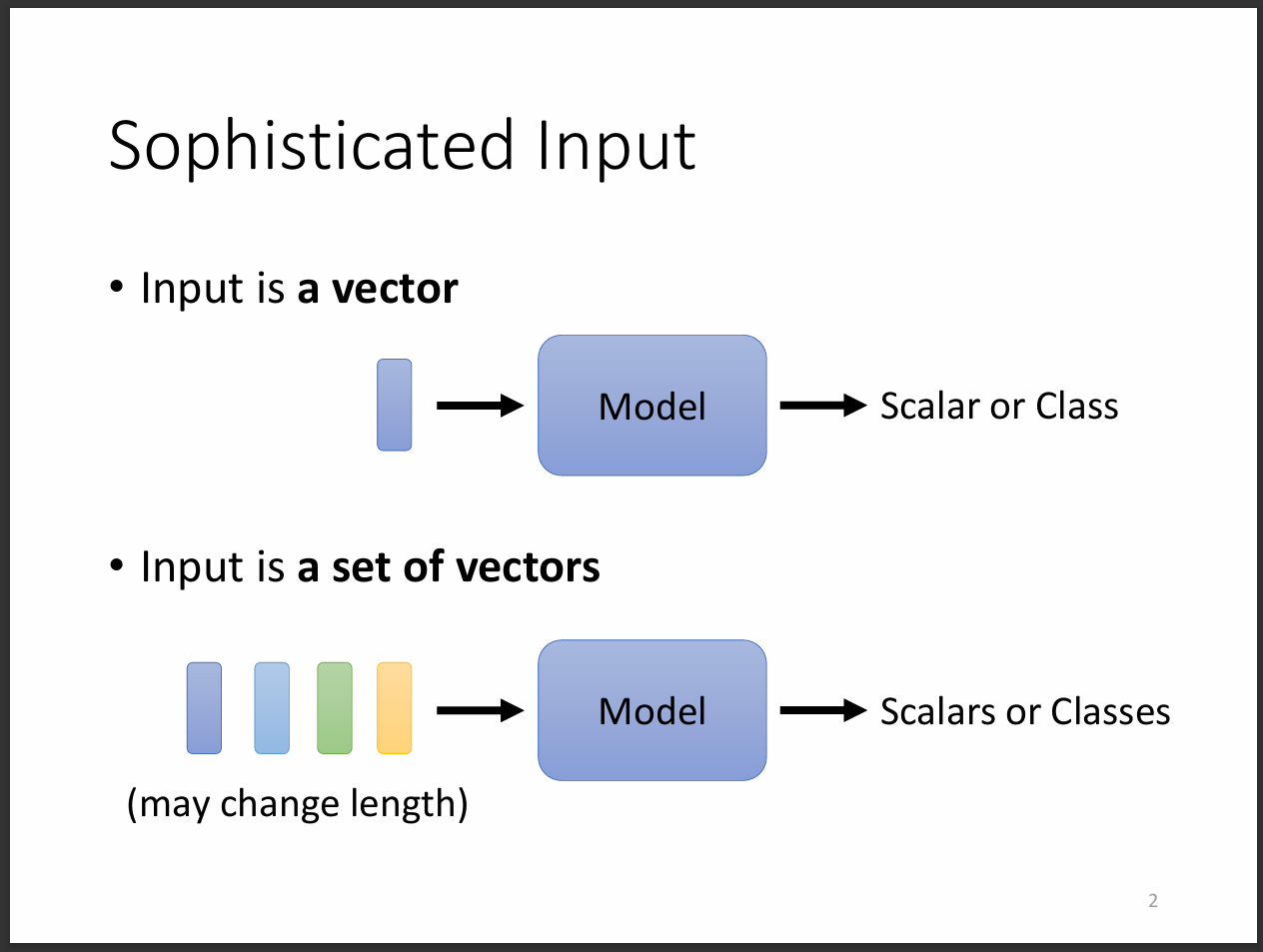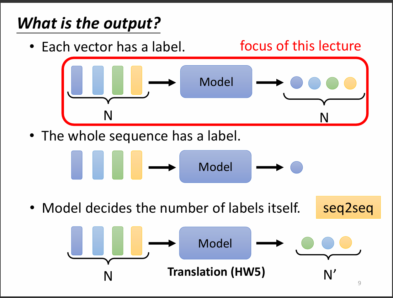 我們從這張圖可以看到輸出大致有三種。第一種是輸入幾個向量輸出就幾個向量,第二種是輸入多個向量只輸出一個向量,第三種則是類似seq2seq的方式輸出,也就是輸入跟輸出的向量數目不相同。