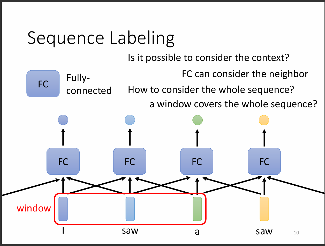 我們可以看到這張圖,每一個input都經過FC輸出一個output,如果不考慮前後文的關係,機器不可能知道怎麼分辨。