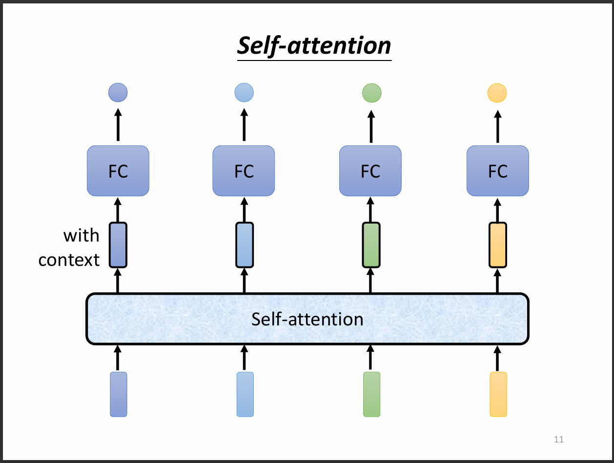如此一來,FC就不是只考慮一個向量,而是考慮整個sequence再來決定要輸出什麼結果。