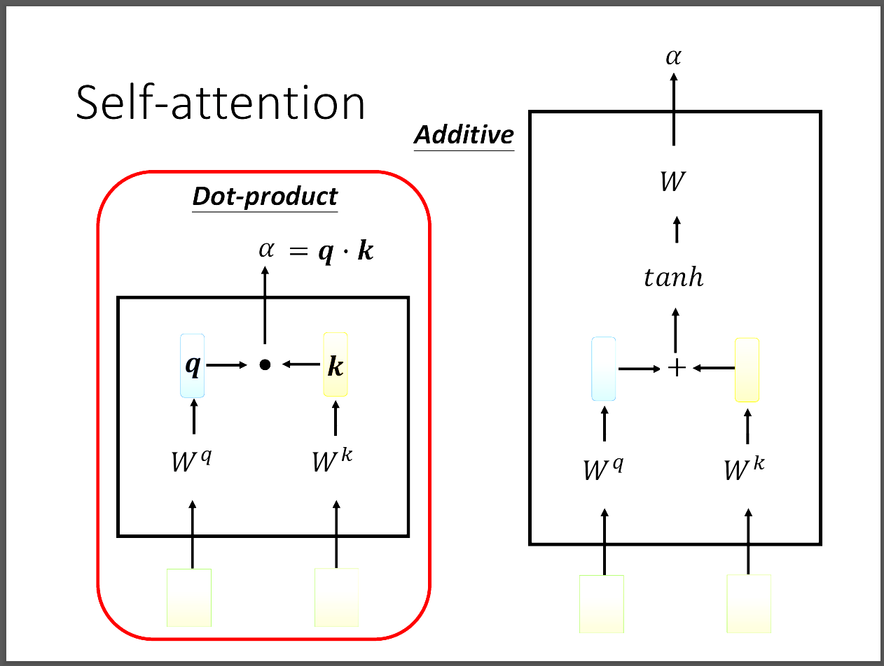 我們判斷的依據是會算出一個關係分數叫做α,可以參考圖片有兩種做法dot product或additive,事實上還有更多種。