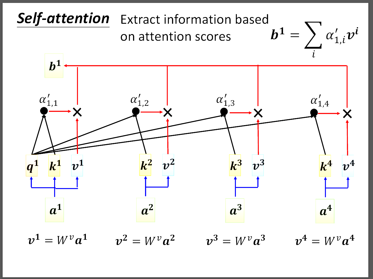 通常會用softmax或其他activation function,再拿這些attention score跟各自的v相成得到輸出b。這裡誰的attention score越大誰就會dominate結果。