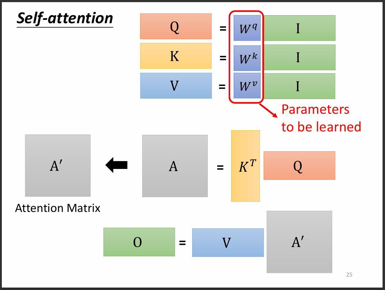 這裡就只有W矩陣需要learn,其他都是矩陣運算,attention matrix就是剛剛說的裡面放有許多attention score的matrix。