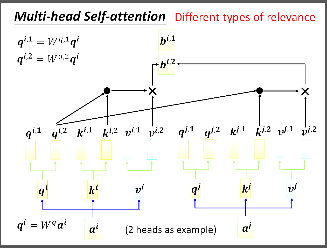 圖片中拿two head舉例,簡單來說就是把剛剛算的qkv都各自成上兩個不同的W矩陣,得到兩個不同的qkv,然後qkv第一個自己運算得到b1,第二個得到b2。