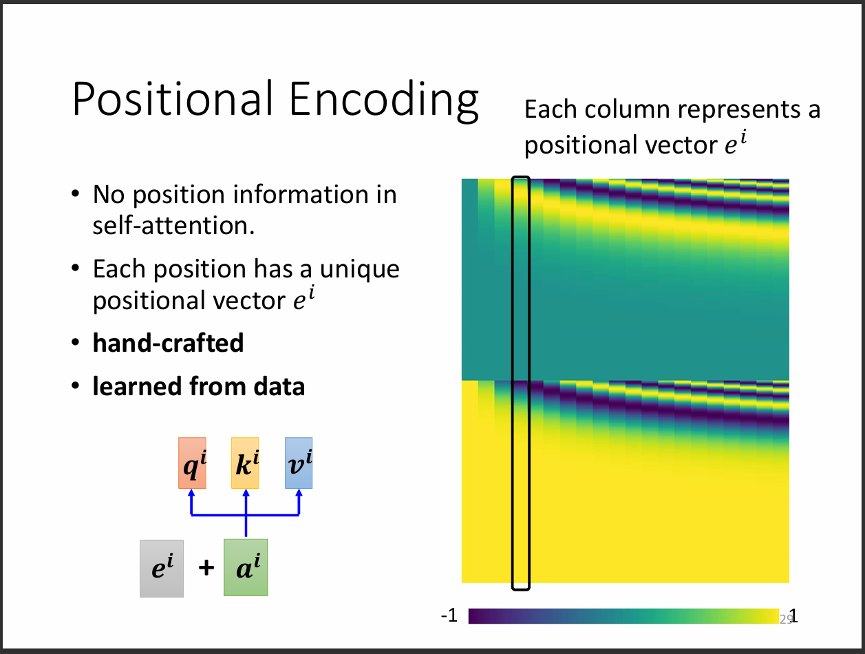但是剛剛self-attention在機器裡面並沒有位置的資訊,也就是不存在a1跟a4比較遠的情況,但事實上在詞性標註的任務我們會需要用到位置的資訊,此時就有positional Encoding這個方法。