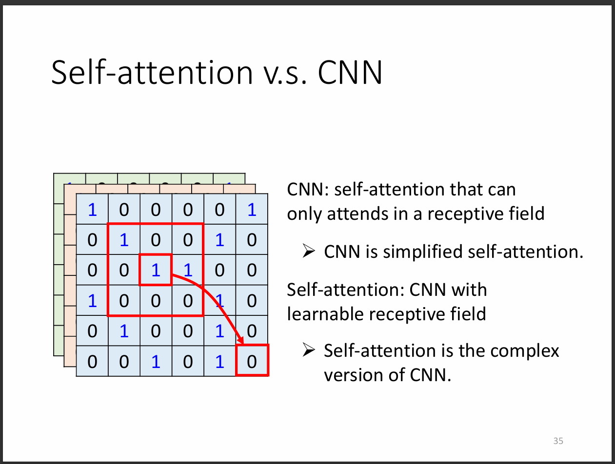 其實self-attention就是比較複雜的CNN,CNN中的receptive field self-attention會自己學習。